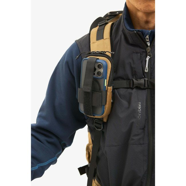 MATERIAL 表地:ECOPAK 200D リサイクルポリエステル 裏地:70D リップストップナイロン 極寒の雪山で、ザックの外に取り付けを想定して作られたモバイルケース。アルミの遮断シートを内臓しできる限りバッテリーの消耗を少なくする。 ケースのポケットはスマホが入る大きさで、表側についているモバイルホルダーはスマホ、無線機などを取り付けられる。スマホのカメラ側を外に向け取り付けるとアクションカメラのように撮影が可能。登坂中に無線機なども外付けすることができます。 サイズ:W90mm x H160mm x D25m