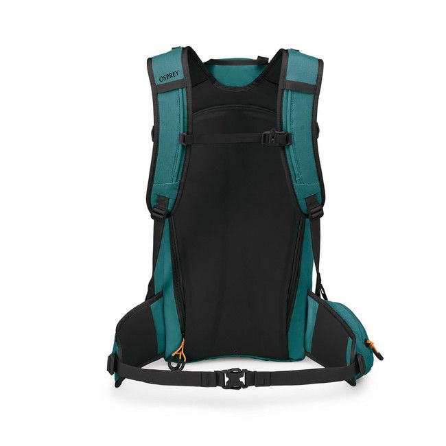 背面、ショルダーベルト、ヒップベルトには身体にフィットするEVAフォームを採用し、背面の表地には雪や氷がつきにくい素材を使用しています。メインコンパートメントへは背面からのアクセス。