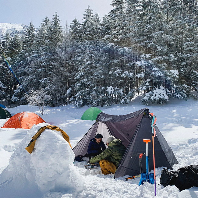 NINJA SHELTERは、軽さと居住性を両立させたシンプルな2ポールシェルターです。フロアレス構造は、日差しや雨露を防ぎつつ開放感を楽しめる仕様で、寒い時はスカートを巻き込んで設営したり、インナーテントと併用することで、河原から雪上まで、使用環境や季節を問わずに使うことができます。