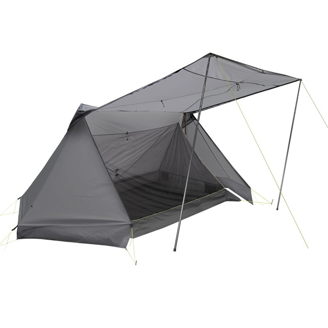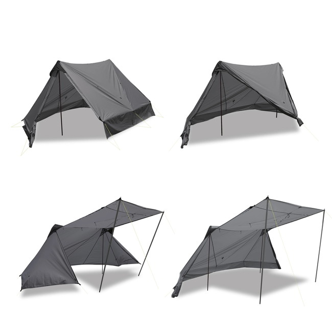 サイド2箇所のファスナーにより、出入り口やひさしを自由に使い分けできます。NINJA STICK(別売りのタープポール)を使えば、フラップを跳ね上げることもできます。