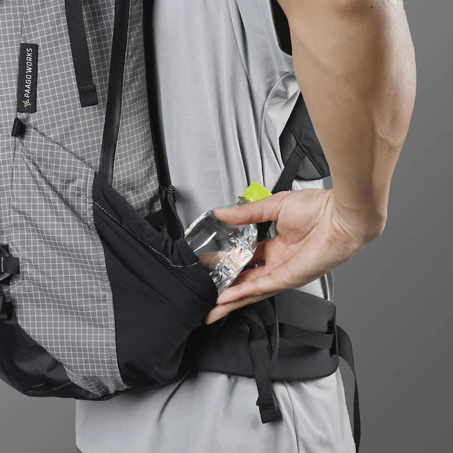 大型のサイドポケットは500mlのボトルが2本入る設計です。背負った状態でも出し入れでき、かつ不意に脱落しない構造です。耐摩擦性の高いストレッチ素材を採用しています。(写真はZENN 35を使用しています。)