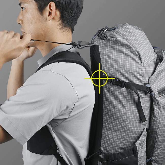 アルパインザックのような細身のシルエットを基本にしながら、肩甲骨の周辺にボリュームを持たせることで荷重バランスを最適化しています。RUSHとBUDDYゆずりの高重心設計です。(写真はZENN 35を使用しています。)