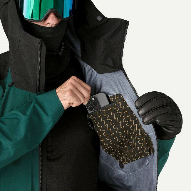 スキーシールや大きめ物の収納に最適な大型のまち付きジッパー式チェストポケットが2つ(1つには内側に携帯電話などを安全に収納できるポケット付き)、ジッパー式ハンドウォーマーポケットが2つ、上腕にジッパー式ポケットが1つ。内側にジッパー式ポケットとドロップイン型ポケットが1つずつ