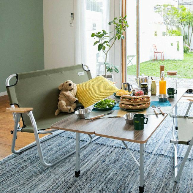 ■ニューデザイン ■安定感あるフレーム構造 ■肌触りの良いウッドアームレスト ■軽量アルミフレーム ■2人でゆったり座れるサイズ ■持ち運びやすいハンドル付 ■折りたたみ収納可能 ●サイズ:使用時/約108×58×67(h) (h)cm ●収納時/約108×10×60(h)cm ●重量:約 3.8kg ●材質:シート/ポリエステル フレーム/アルミニウム アーム/天然木