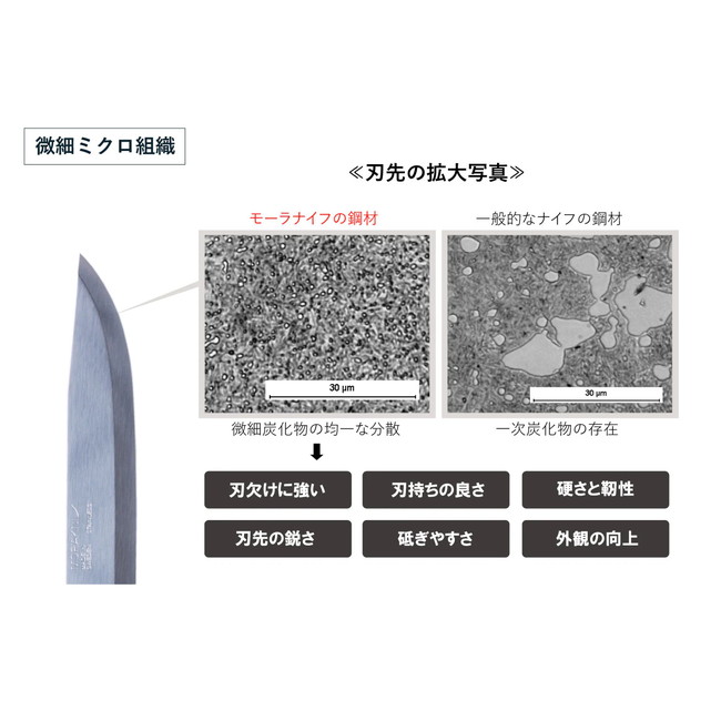 モーラナイフの全てのステンレス鋼のナイフで、プロダクトに関係なくAlleima社のこれらの高度な技術を採用。そこにモーラナイフが独自に加工・製造を加え、他のナイフメーカーの鋼材と比較しても、出すことが難しい切れ味や耐食性を実現しており、他の追随を許しません。また、自社の工場で大量生産をすることにより、その高度な技術を良心的な価格で提供。世界で最も信頼され、手に取られているナイフとなっています。