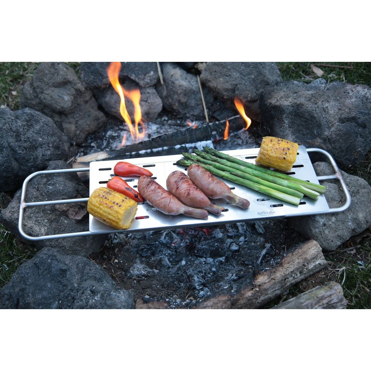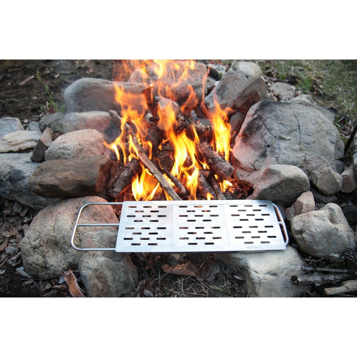 コンパクト・軽量・携行性を追求した焚火スライドグリル、直火が許される場所では,これさえあれば調理が出来る。