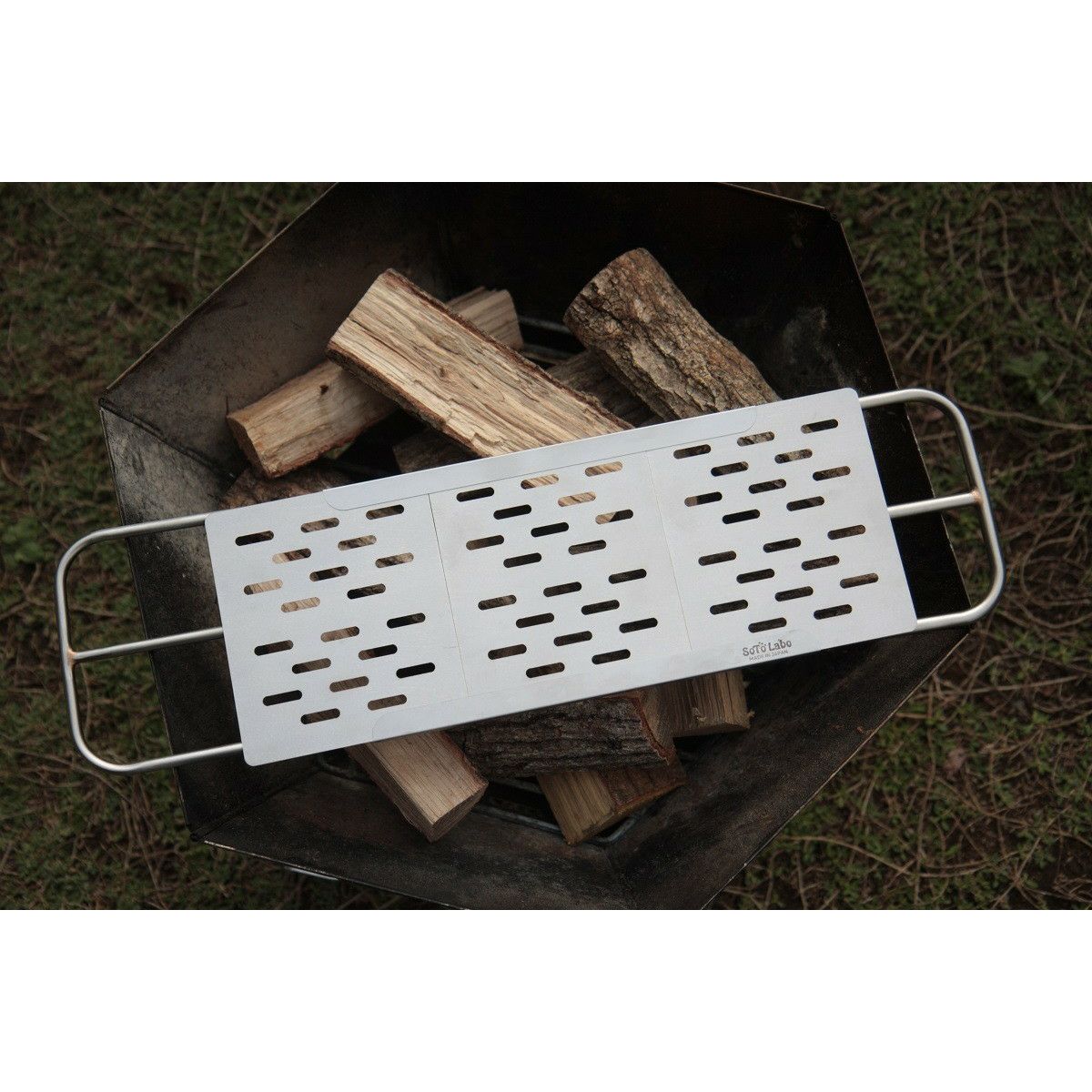 わずか約360gの最小限のミニマムキッチン。スライド式ゴトク&拡張式グリル網であらゆる焚き火台を網羅する。