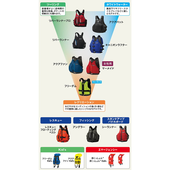 川から海まで幅広いパドルスポーツで使用できるレスキュー機能を備えたライフジャケットです。フロントオープンタイプで着脱しやすい仕様です。体の形に合わせてフォームを立体成型することで優れたフィット感を実現。背面の生地を横方向に伸びる構造にすることでパドリング時のあらゆる動きに追従し、非常に高い運動性としめつけ感の少ない着心地です。 カウテール(別売)やシートウイングライン(別売)を装着するためのレスキューベルトやナイフホルダー、カラビナホルダーなどレスキューに役立つ機能が充実。 胸部分の2つの大型ポケットなど、収納力も大変優れています。
