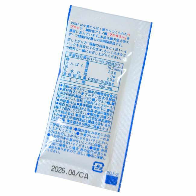 小麦グルテン加水分解物(WGH)(国内製造)、ぶどう糖/クエン酸、糊料(プルラン)、香料、甘味料(スクラロース)