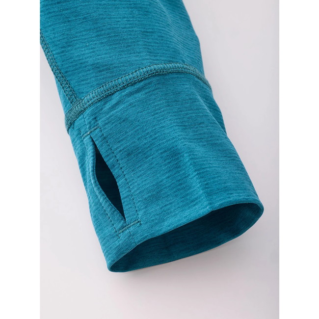 ロングスリーブはラグラン仕様のスリーブに加えて、両脇にパネルを追加することでROM(可動域)を確保し、ストレスなく腕を上げ下げできます。 袖にはサムホールを備えて、ランニングやクライミングで袖がずり上がるのを防ぎます。