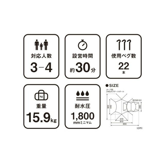 テント本体/75Dポリエステルタフタ・PUコーティング耐水圧1,800mmミニマム・撥水加工・UVカット加工、インナーテント/68Dポリエステルタフタ(ウォール部)210Dポリエステルオックス・PUコーティング耐水圧1,800mmミニマム(ボトム部)、フレーム/A6061(Φ13mm)