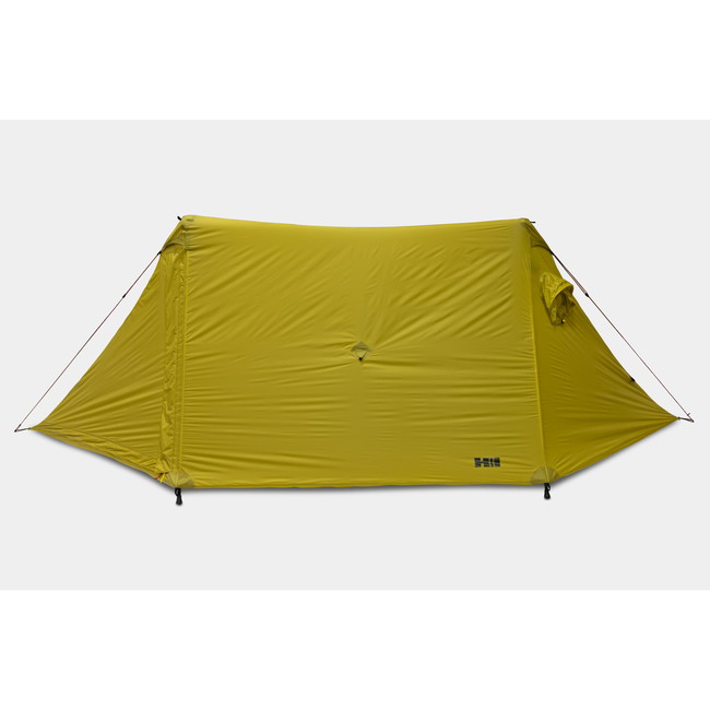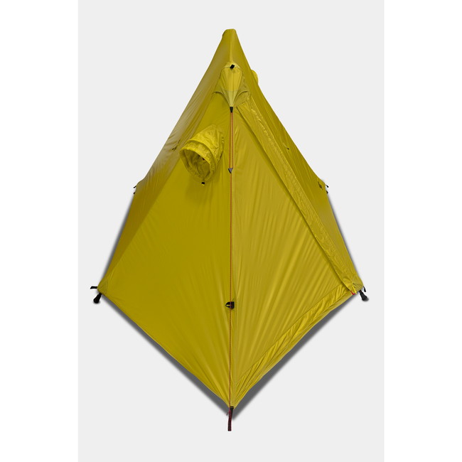素材には日本製高強度10Dナイロンリップストップ透湿PU<2G>コートを採用し、シームシーリング済です。 前後にある出入口は2本のファスナーを逆L字に配置しているので大きく解放します。縦ファスナーは上からも開くので、リング芯内蔵のベンチレーターと連動し効果的な換気が可能です。