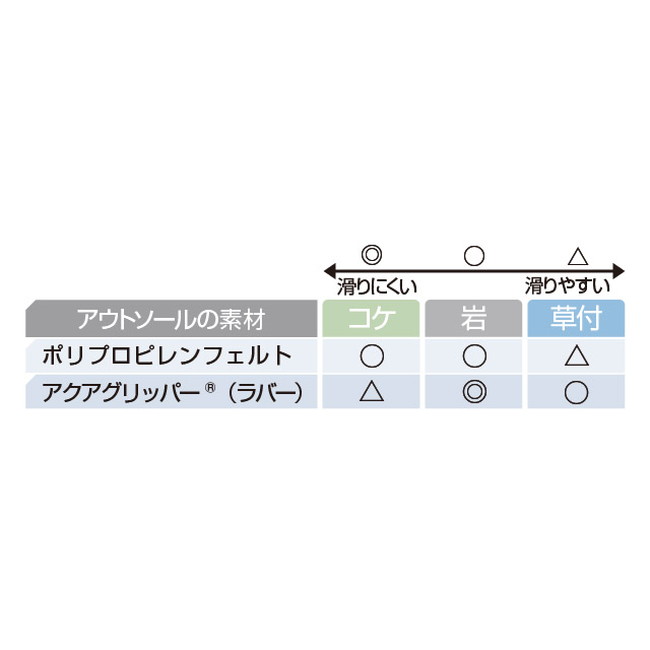 ポリプロピレンフェルト:水を含みにくい素材で、ぬめりのある水垢やコケなどに対して優れたグリップ力を発揮します。反面、草付きの斜面や泥の上などでは滑りやすいので油断は禁物です。