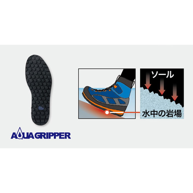アクアグリッパー(ラバー):モンベルが独自に開発したアウトソール「アクアグリッパー」は濡れた岩に対してグリップ力が高いのが特長です。反面、ぬめりのある水垢やコケに対しては滑りやすいので注意が必要です。
