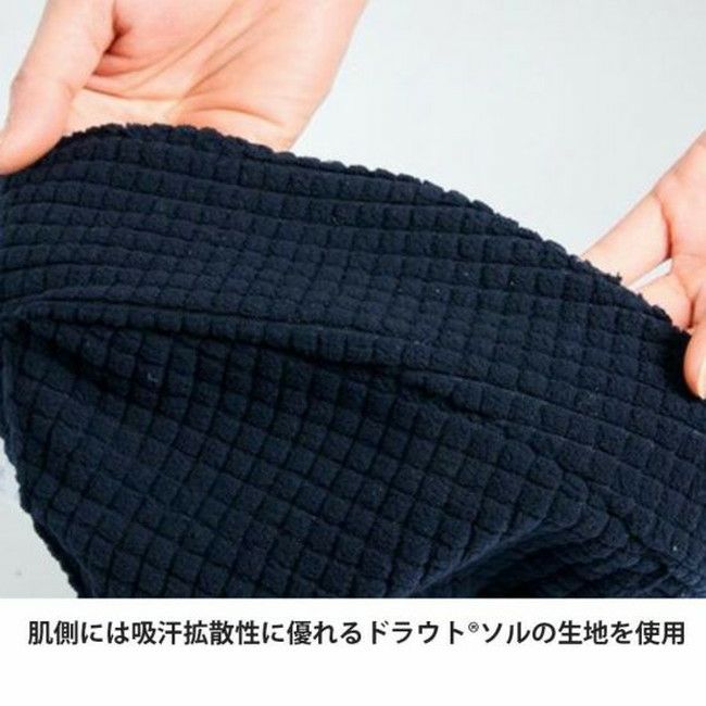 肌側には保温性と吸汗拡散性に優れたドラウト®ソルの生地を採用しており、保温性に優れると同時に汗などで濡れても冷たくなりにくいことが特長です。