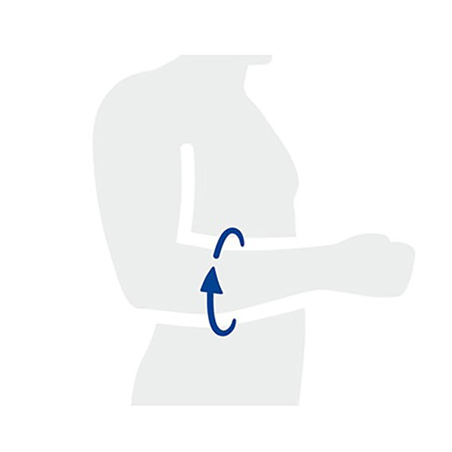 肘を軽く曲げた状態で、前腕部に軽く力を入れた状態にし、前腕の一番太い部位の周径を計測します。