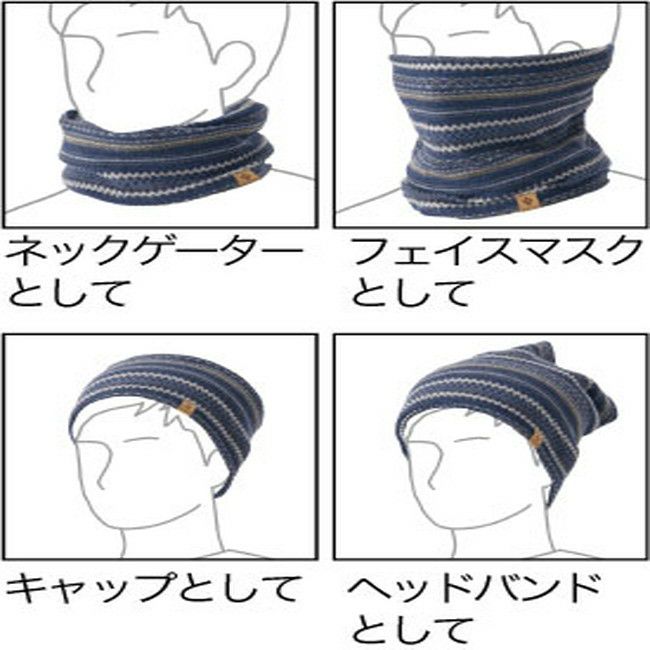 保温性に優れたメリノウールを、カラフルなジャカード柄に編み立てたネックゲーターです。たいへん滑らかで肌触りが優しく、上部にゴムを入れることでズレにくくなっています。首元から目元まで覆うことができ、キャップとして使用できるなど、折り方によって多彩な着用が可能です。