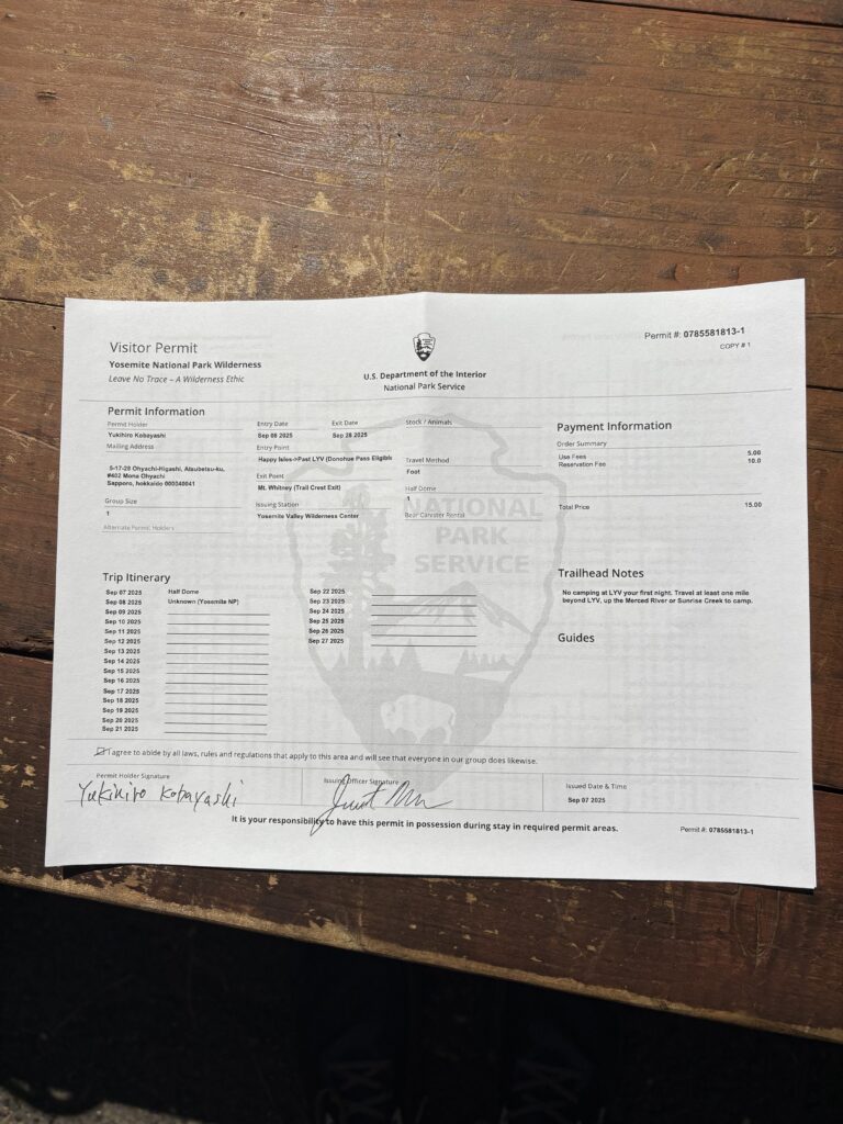 英語が得意な方なら問題ないのですが、発行にあたって1回目の補給可能地点であるトゥオルミメドウズまでの行程を、公園を管理するレンジャーに英語で説明しなければなりません。急遽SOBOに計画を変更した為、行程のことがしっかりと頭に入っておらず、しどろもどろの説明になってしまって上手く伝わりませんでした。最後にはレンジャーも諦めて、もういいよみたいな雰囲気でなんとか発行することが出来ました。