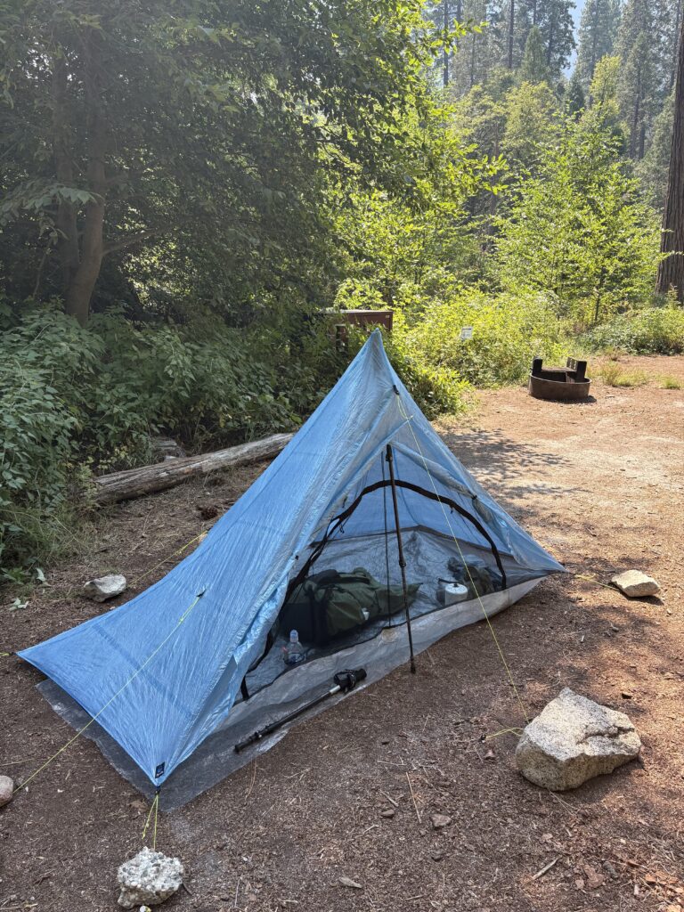 アメリカで初のテント設営完了。地面がとても固く、ペグが全く効かなかったので石を使って固定。1区画ごとにクマ対策のフードコンテナと焚火用のファイヤーピットが設置されています。ここではあまりクマの心配は無いと思いますが、至る所にリスが歩き回っているので、食べ物の管理は注意が必要です。