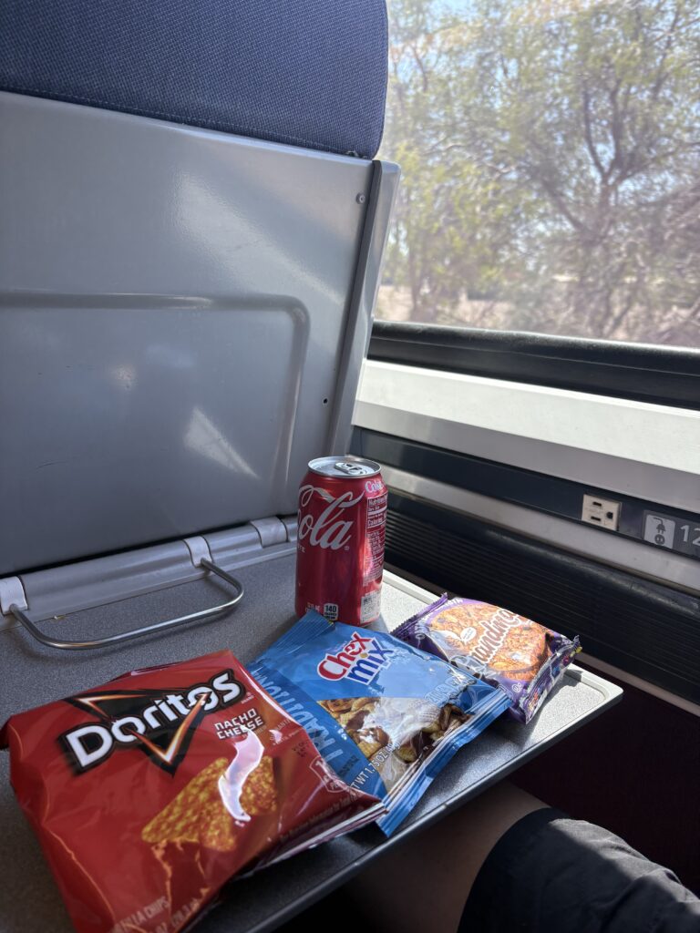 電車の1車両に大量のスナック菓子と炭酸飲料がテイクフリーで積まれており、みんな両手に沢山のお菓子を抱えて自分の席に。日本では考えられないシステム。トレイルの行動食用に多めに貰っておきました。