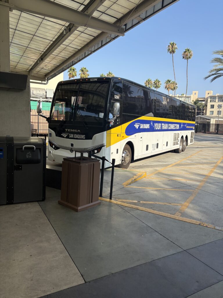 ヨセミテ行きのバスに乗るためにフレズノという町に向かいます。フレズノにはヨセミテに最も近い空港、フレズノ・ヨセミテ国際空港がある玄関口です。日本からの直行便はありません。フレズノへはロサンゼルスにあるアールデコ調の歴史的に有名な駅、ユニオンステーションからアムトラック(バスと電車)に乗ります。駅構内、駅までに乗った地下鉄の車内にも銃を持ったガードマンがいて、アメリカにいることを再確認する場面も。