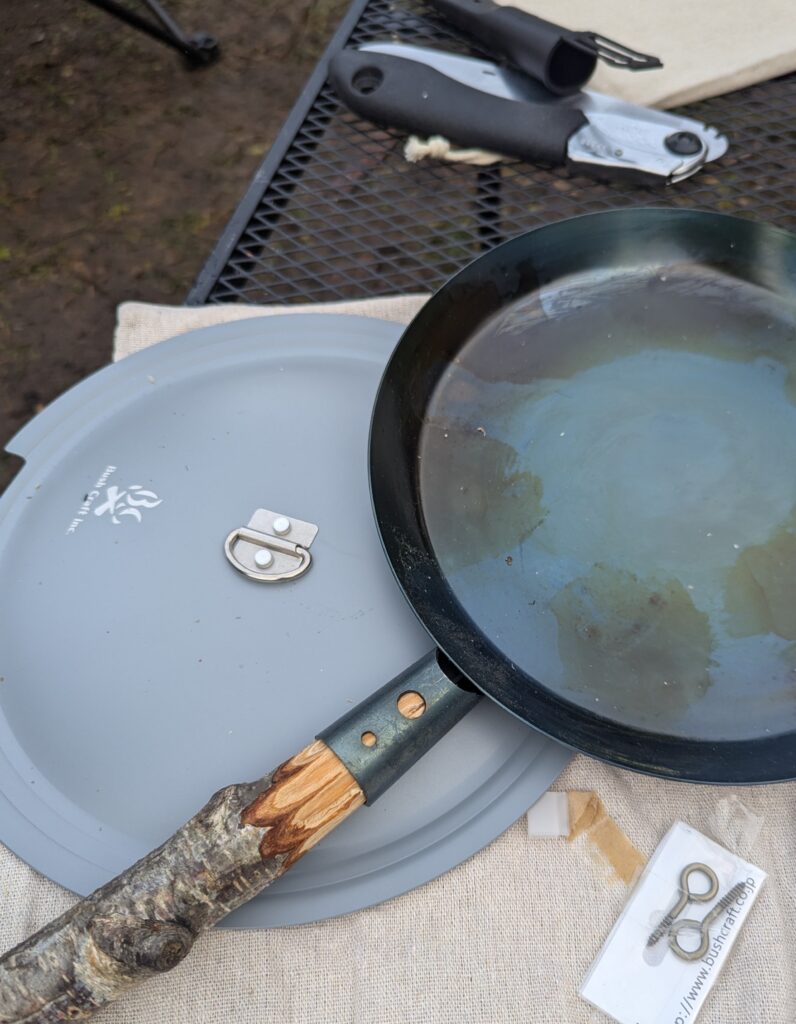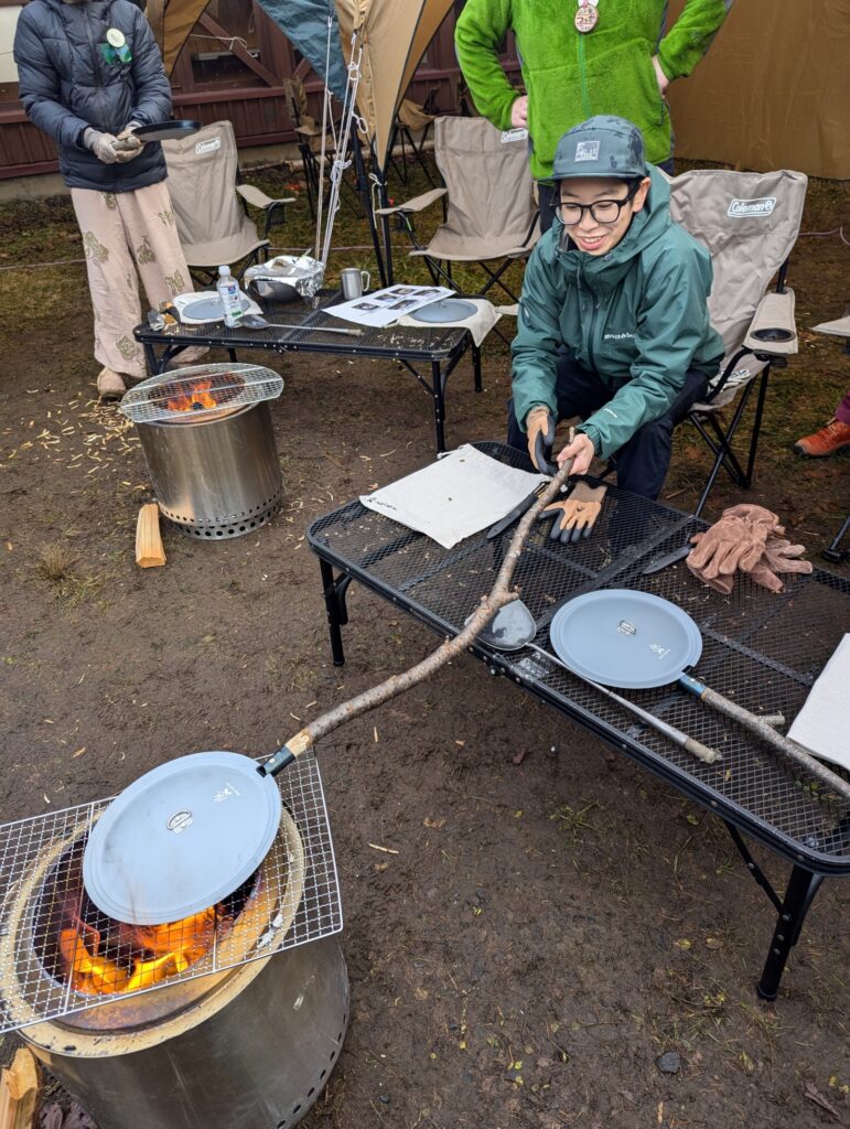 ▲2日目、朝食は「焚き火フライパン」を使ってのパンケーキ作り。
