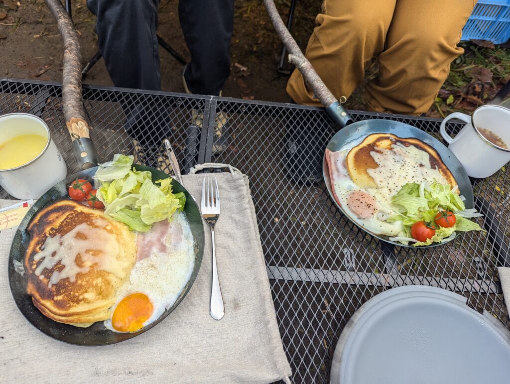 ベーコンエッグも加わってゴキゲンなキャンプ朝ご飯を堪能。