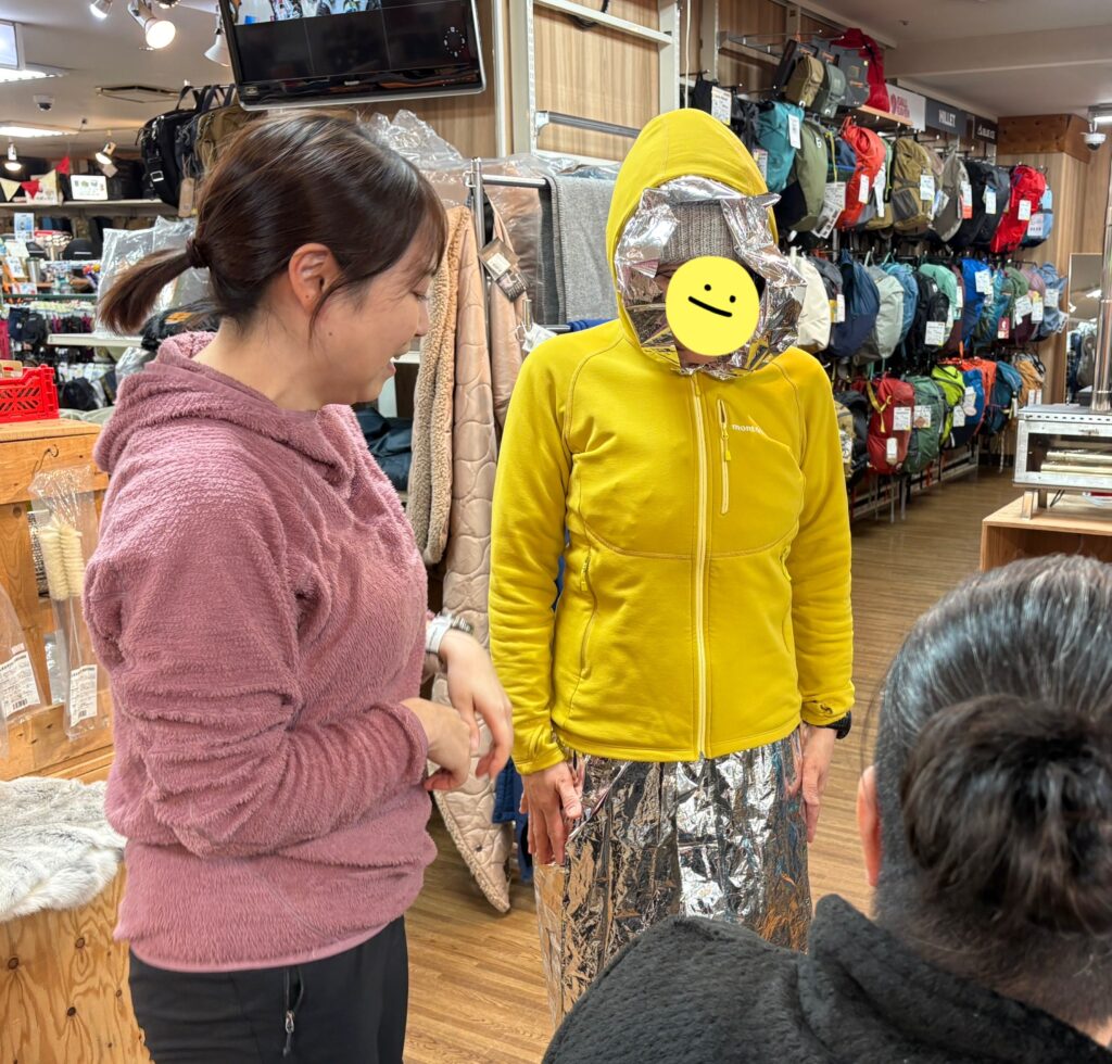 外では低体温症になってしまった人を保温するラッピング方法を実演しましたが、
