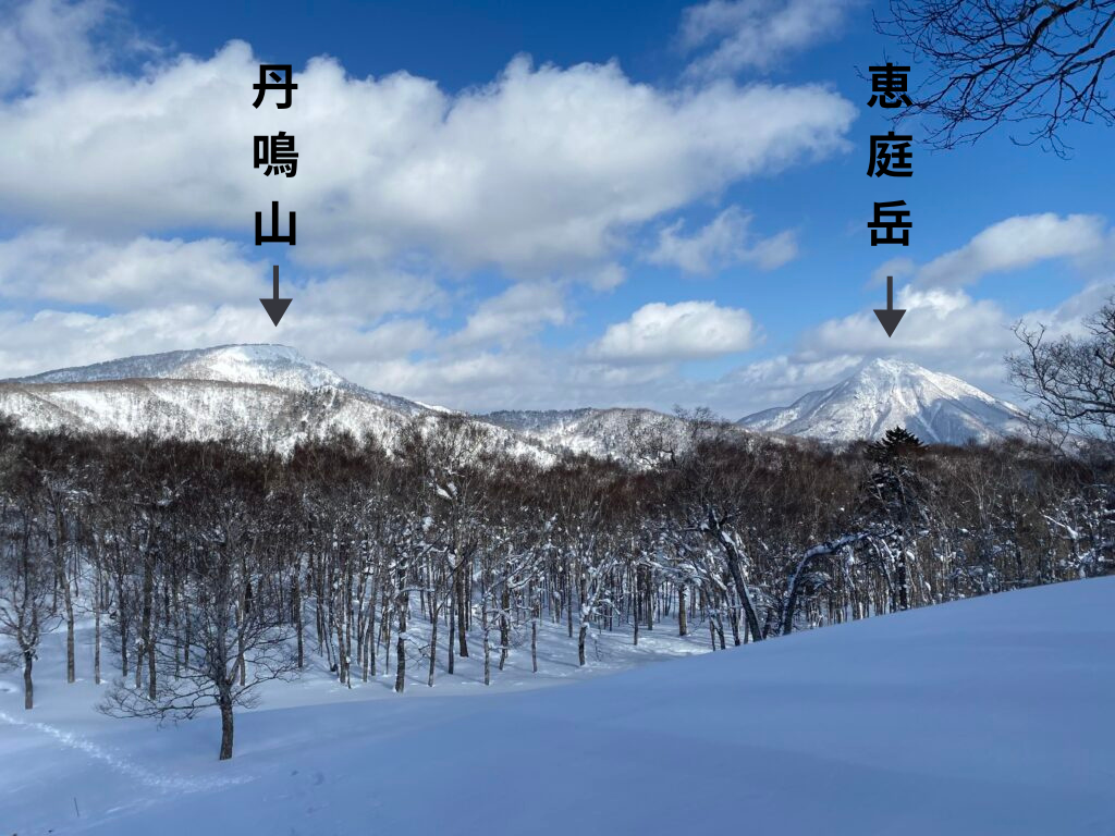 左の白い山が【丹鳴山1039.3m】、右の山が【恵庭岳1320m】です。