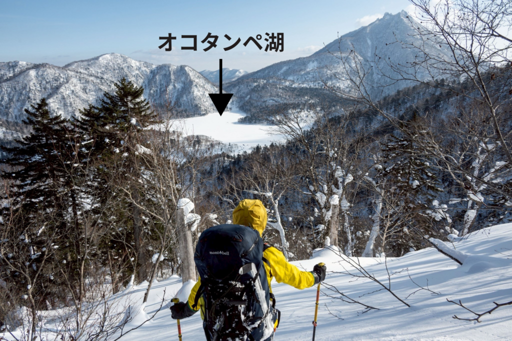 キャンプ地点からフレ岳北峰→振丁→全面結氷したオコタンペ湖を横断して恵庭岳登山口駐車場へ下山する。