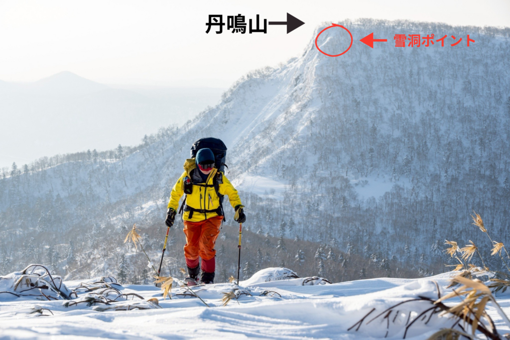丹鳴山を少し下ったところで、どこに雪洞を掘るのか、とりあえずプローブを差してみた。