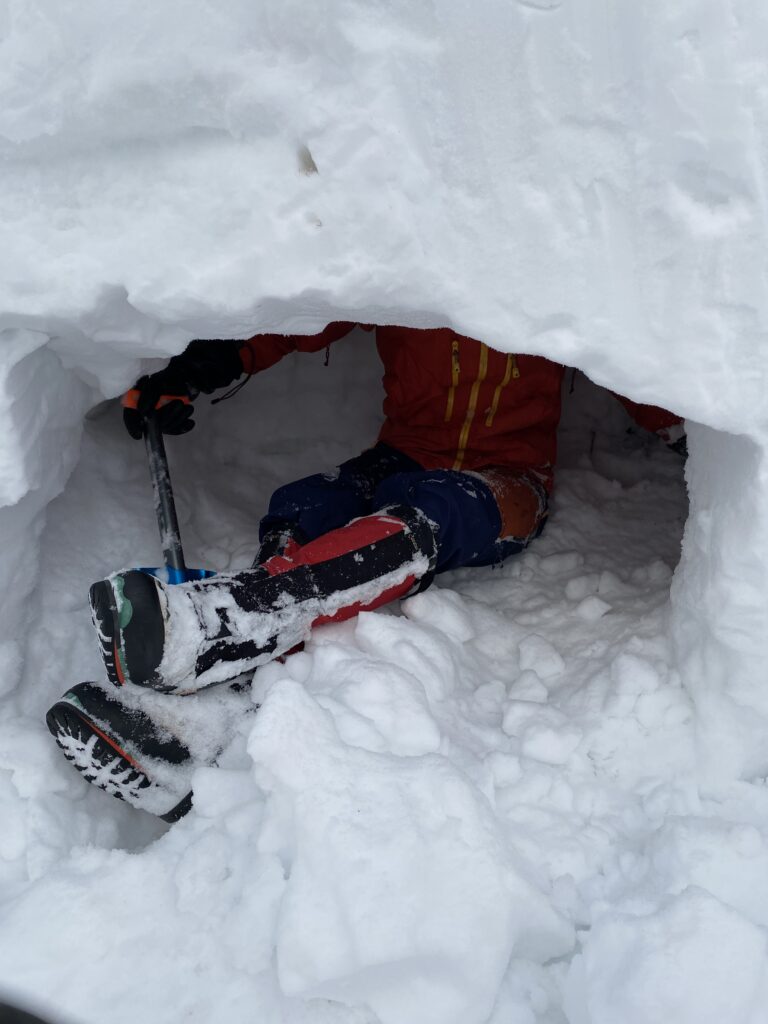 こんな感じで雪洞は約50分で完成。あぐらをかける高さの快適空間です。