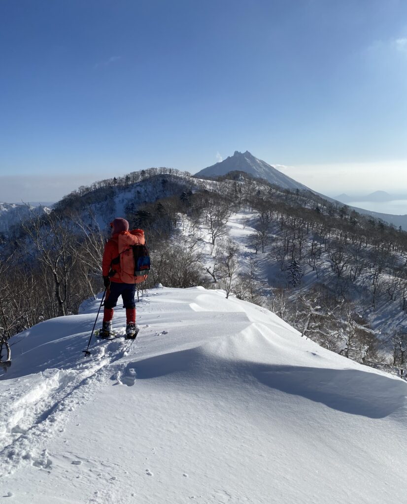 スプリットボードで行きたかったけど、稜線上にアップダウンが多数あり、尾根までに急登あり、登るのが大変だと予想できたので、のんびりスノーシューで行くことに決めました。