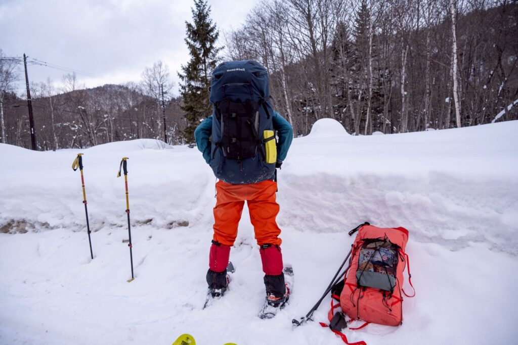 今日の足周りはスノーシューです。雪洞泊の荷物がずっしり。