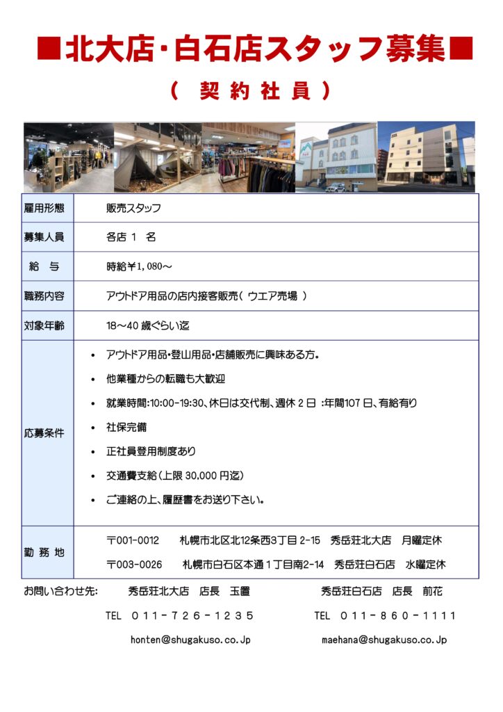 北大店・白石店スタッフ募集(契約社員) スタッフのおすすめ 北大店 小野社長 白石店 2026.03.13 shugakuso_365日アウトドア社長 北大店白石店契約社員募集R8.3.12ダウンロード writer 小野社長 « 前のブログへ ブログ一覧