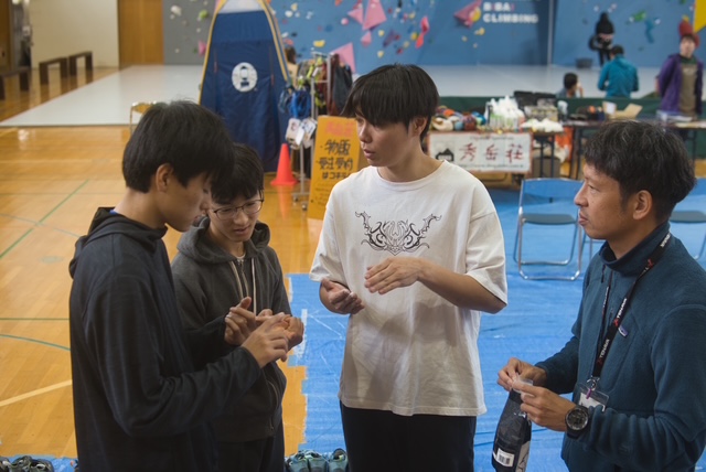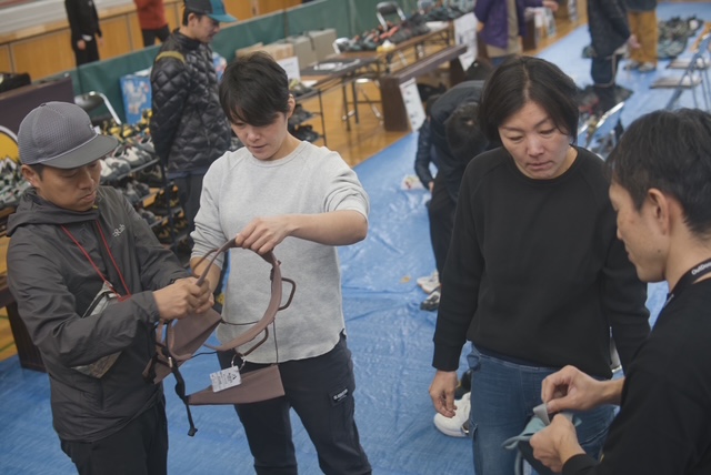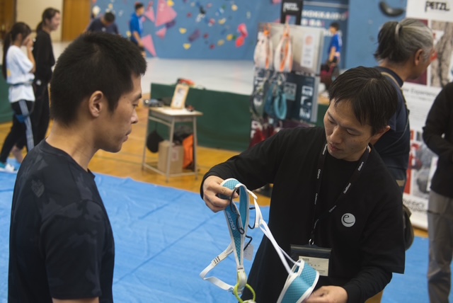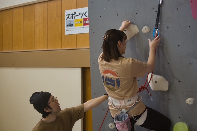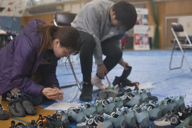 1日目は初心者、未経験者メイン。美唄市地域おこし協力隊の方々がサポートしながらリードクライミング、ボルダリングを体験いただきつつ、いろんなクライミングシューズやハーネスを試用。