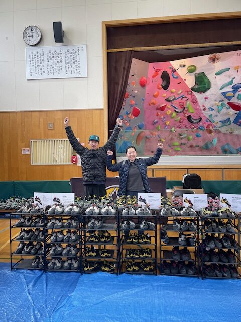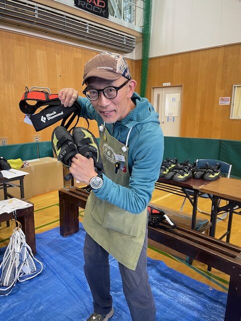クライミングシューズ過去最多約200足(多すぎ!!)に加え、今回は立派なリード壁もあるということで、ハーネスやギア類も持ってきていただきました。