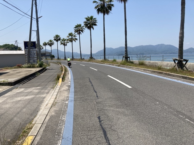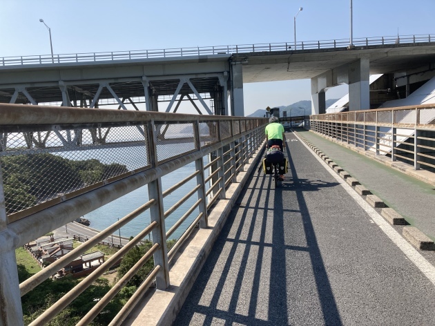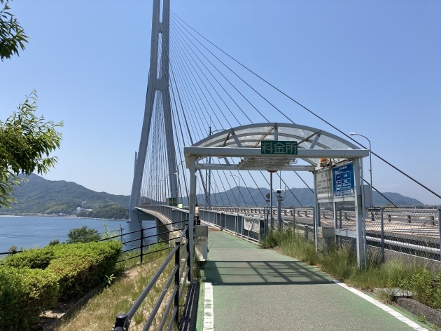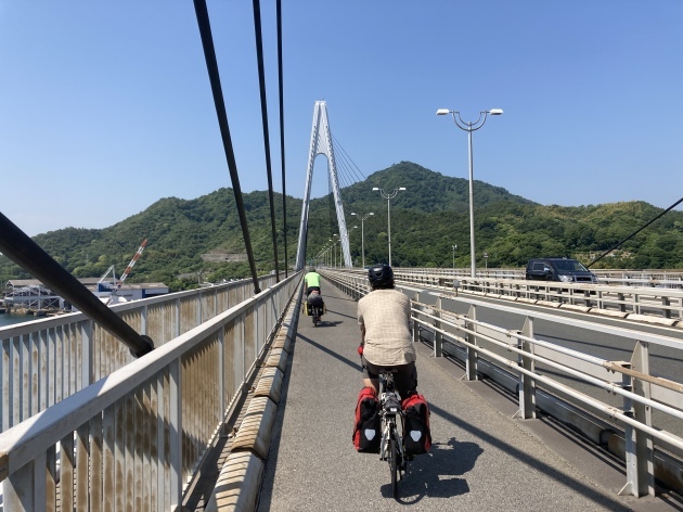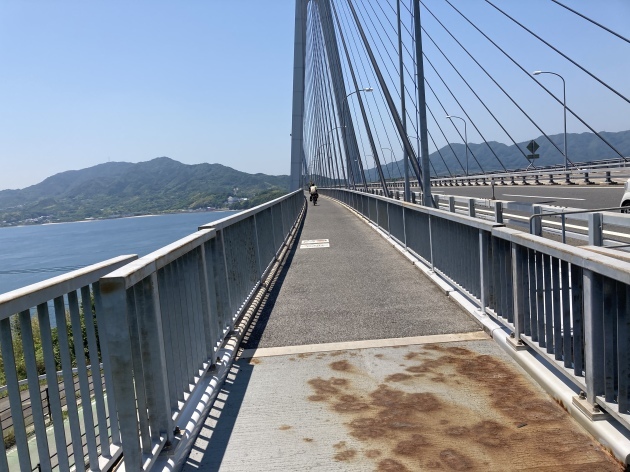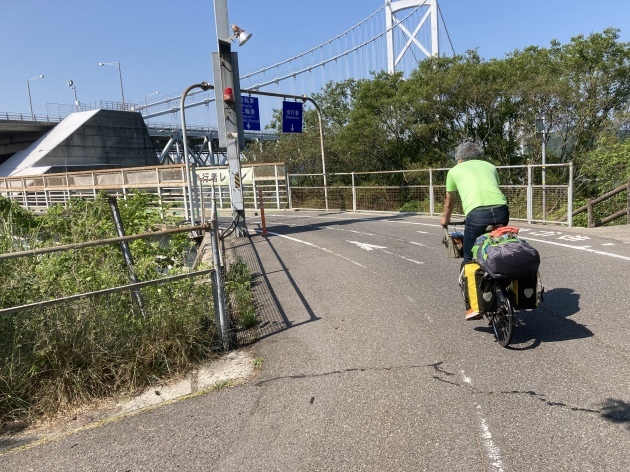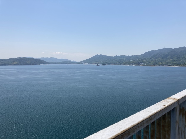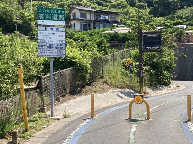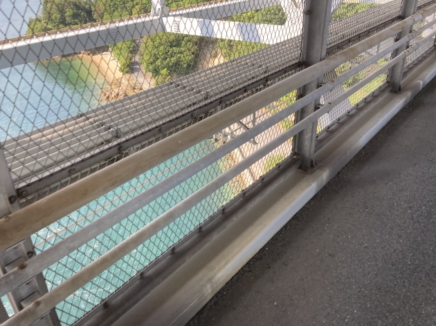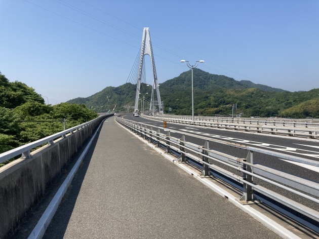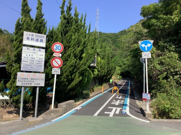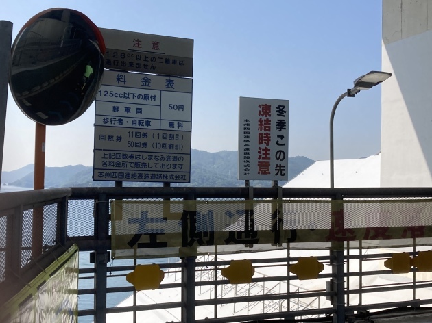 橋を渡る道は有料道路となっており125cc以下のバイクまで通行可能です。バイクの通行料金は50円(安い)自転車はタダ。ちなみに高速道路 車で渡る場合結構お高い様です。聞いた話ですが地元の方は隣の島にパンを買いに歩いたり自転車、バイクで渡るそうです。
