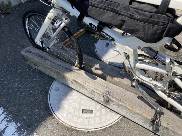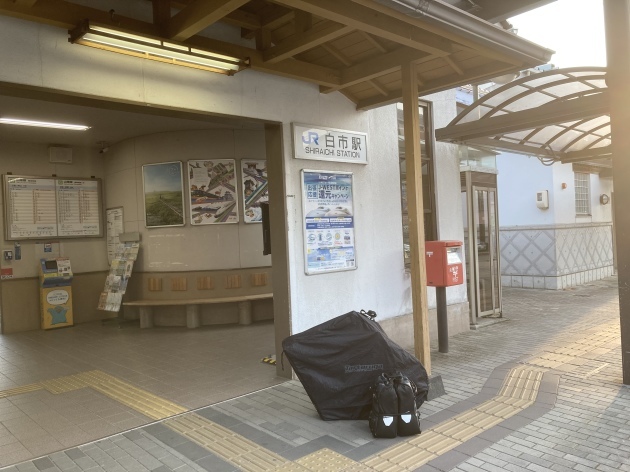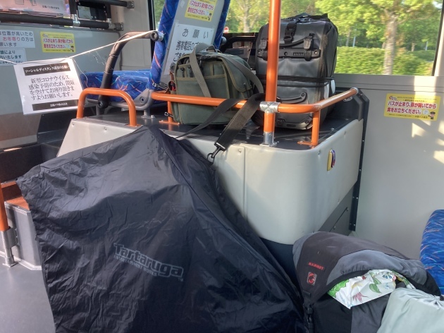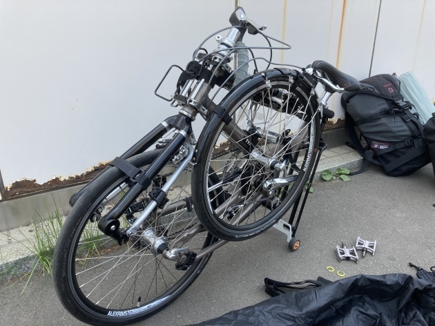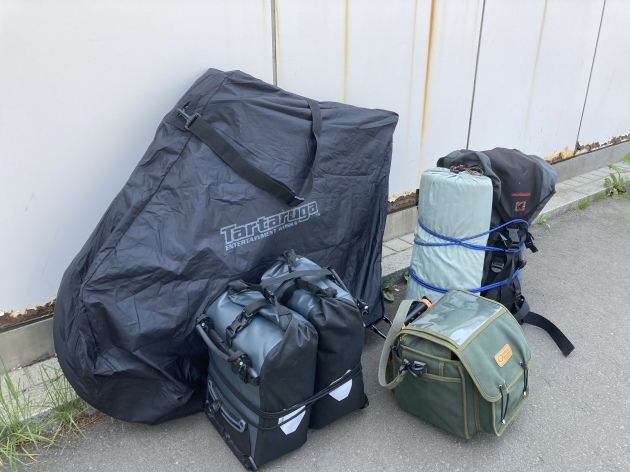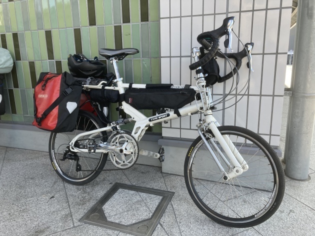 最寄りの駅で折り畳み輪行袋に入れ荷物をまとめます。