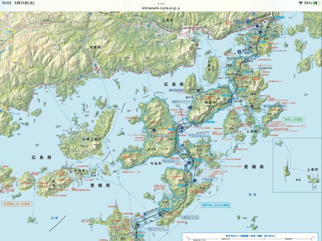 ガイドマップに載っているしまなみ街道しまなみの島々向島、因島、生口島、大三島、伯方島、大島本州広島側から四国愛媛県側に渡れる全長約70Kmのサイクリングコース5つの橋を渡り6つの島を巡ります。