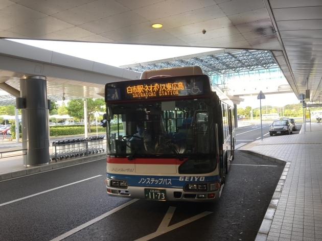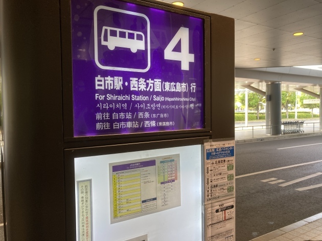 今回のしまなみは広島側ルートなので尾道をスタート地点に設定広島空港から尾道に向かうルートの一つをご紹介まずは広島空港からJR白市駅にバスで移動します。到着ロビー出たところの4番バス乗り場より1時間に一本間隔でバスに乗れます。別ルートで三原市行きのバスもありそこからJRで尾道に行くコースもありますが本数が少なく今回は白市駅経由のコースです。